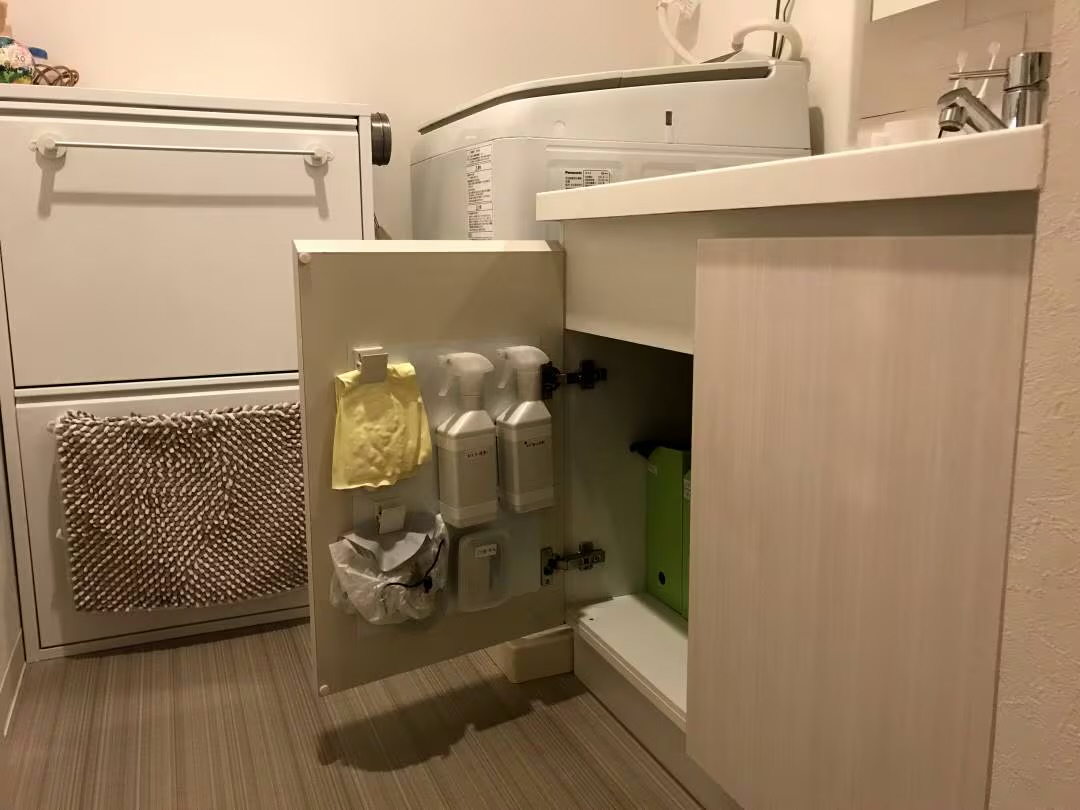 洗面所の収納スペースとして代表的なのが、洗面台下の扉付き収納です。多くのご家庭でこのスペースを活用していると思いますが、「扉を開けるとモノが雑多に押し込まれている」「奥のほうにあるものが取り出しにくい」という状態になっていませんか?洗面台下収納は意外と高さがあるにもかかわらず、棚板がないため縦の空間が活用できず、床面にモノを重ねるだけになりがちです。