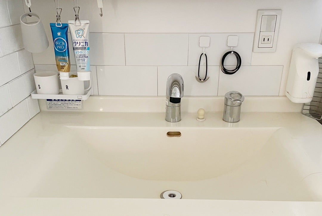 洗面台の上やシンク周りに、歯ブラシ・コップ・ハンドソープ・歯磨き粉などが雑然と並んでいませんか?これらのアイテムは毎日使うものだからこそ出しっぱなしになりやすく、洗面台が常に「置き場が足りない状態」になりがちです。しかも洗面台の上にモノが多いと、台を拭く際に毎回どかさなければならず、掃除の手間も増えてしまいます。
